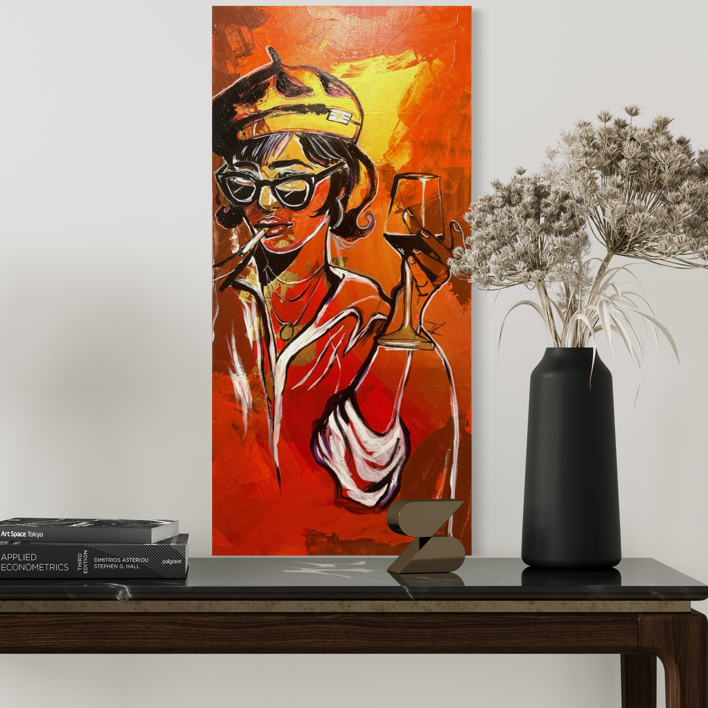 The painting is an expressive, modern pop-art style portrait of a stylised woman set against a warm orange-red gradient background. She’s wearing a yellow cap with a small white-and-gold emblem, black-framed glasses, a white shirt over a red top, and a gold necklace. The figure holds a wine glass in her right hand and has a cigarette in her mouth. The brushwork mixes bold black outlines and white highlights with textured red and gold acrylic washes, giving the piece an energetic, edgy vibe.